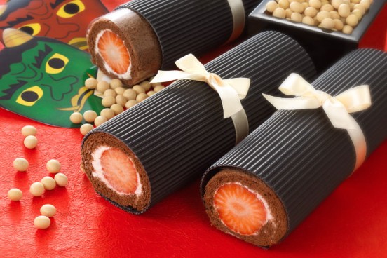 チョコレート風味のスポンジ生地であまおう苺と生クリームを巻いて、恵方巻きに仕立てました。