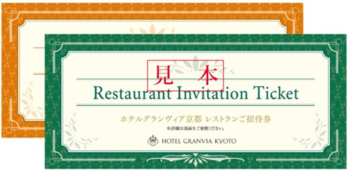 | ■ ホテルグランヴィア京都・レストランご招待券 対象レストランにて、特別メニューをご用意いたします。 ¥5,000・¥10,000 2種類をご用意 ※1枚で1名様分ご利用いただけます。 |