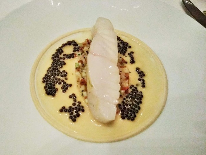 | 魚料理 | テュルボ(平目)のバプール セロリラブのピューレ キャビア入シャンパンクリームソース |