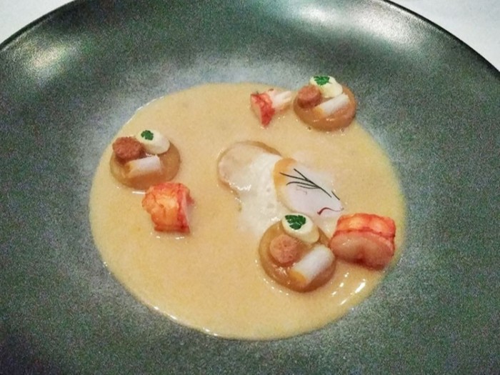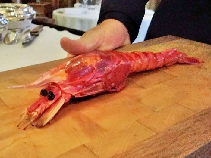 前菜は、ローストされた大きな海老をサービスマンが目の前でカッティングし、お皿に盛りつけてくれます。ソースは魚介のスープをベースにしており、皿全体が海の香りで満たされます。
