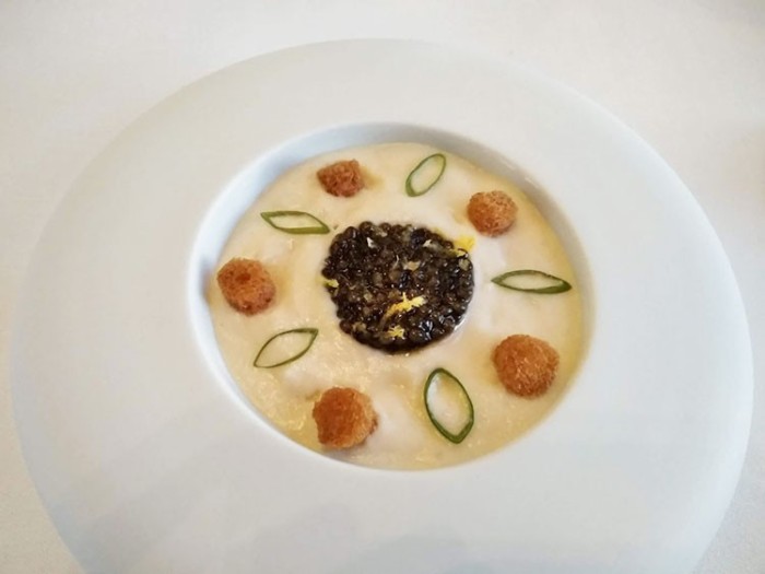 | アミューズ | 温かいカリフラワーのエスプーマにキャビア コキヤージュソース |