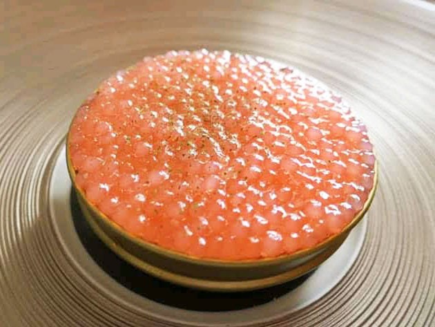 デザートは、キャビアの缶に見立てたもので、見た目とは裏腹に苺とランスのお酒「ラタヒフィア」の香りが優しく、程よい甘さの一品でした。