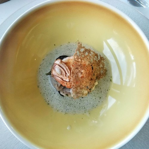 | 前菜② | ラングスティーヌのポワレ シャンボニエのエテュベ サラザンのテュイル スペルト小麦のジュ、ハーブバターソース |