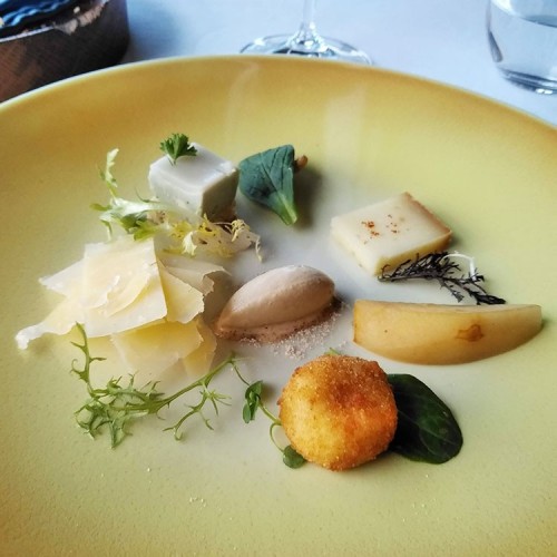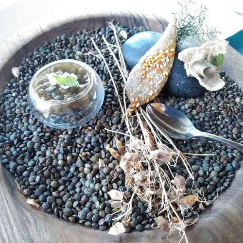 | アミューズ | シャンピニヨンのデュクセル スフェリフィカス アーモンド サパンの香り ランティーユとコンソメジュレ レフォールのクリーム アンギーユの燻製 七味のテュイル そば粉のテュイルフリット ランティーユのピュレ |