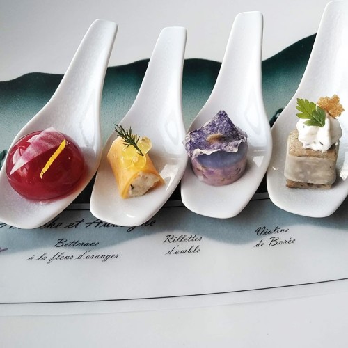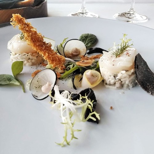 | 前菜① | ホタテ貝のミキュイ マロンのテュイル セロリラブのレムラード トリュフ添え ホタテ貝にレモンコンフィ パネアラングレーズ アンディーヴのブレゼ 茸添え ジュードコキアージュ |