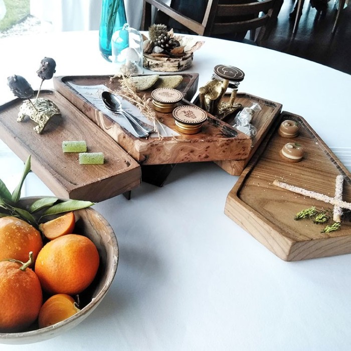 | プティフール | セップのヌガー ミカンと柿 ランティーユのキャビア パートフリュイ ヴェルヴェーヌ シュセット グラッセ ランティーユのテュイル ブランシュ ロジェ チョコセップ |