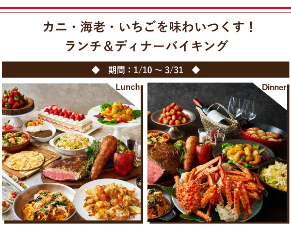 カニとお野菜のパスタや海老のプランチャなどのほか、ディナー限定でカニ3種のボイルも食べ放題!