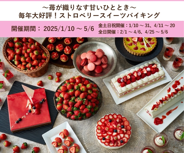 5種のフレッシュ苺をはじめ、苺ショートやムース、プチタルトなど苺をふんだんに使ったスイーツが食べ放題!【シェフの一皿】こぼれ苺~雫の里~は、京都亀岡 雫の里農園にて栽培している女峰を使用した一品。(小学生以上のお客様に一人一皿提供)