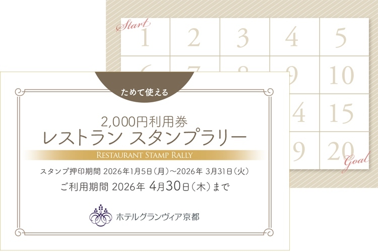 期間中に対象レストランをご利用いただくと、 ご利用金額に応じてスタンプを押したカードをお渡しいたします。 スタンプが20個たまるとレストラン2,000円券としてご利用いただけますので、 ぜひこの機会にスタンプを集めてお得にレストランをご利用ください。 |