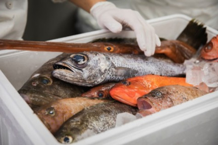 魚の状態を説明する[与力水産]の吉村社長(写真右)と聞き入っている総料理長 柏木(写真左)。競り落とした魚は[与力水産]が下処理を全て手掛け、鮮度が保たれた状態で[ホテルグランヴィア京都]へ直送されます。