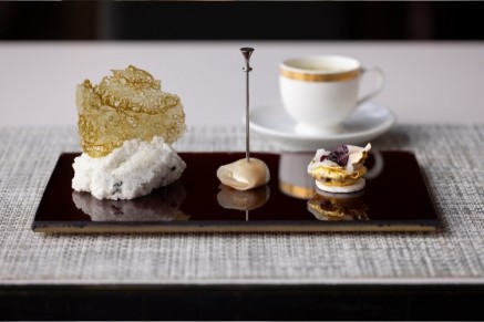 宿毛湾の魚を全メニューに取り入れたアミューズの一例。魚のチュイル(写真左)、鰤の生ハムと水茄子(写真中)、アオリイカのムース 完熟梅添え(写真右)、ブイヨンスープ(写真右奥)。