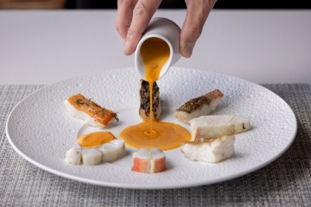 この日の魚は、上から時計回りにクロムツ、ヨコスジフエダイ、ウスバハギ、オオモンハタ、アカヤガラ、クエ、アカハタの7種類。スープはサービススタッフがお客様の目の前で注ぎます。