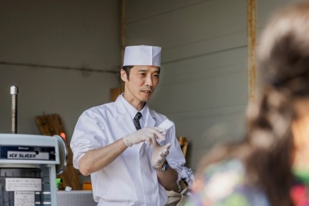 人の手で植える大変さを実感した後は、子どもたちと保護者の方々にお米を使ったスイーツを食べていただきました。スイーツをふるまう前には、料理長 三瀨が食育の観点から講義を実施。『浮橋』で京都山城産ヒノヒカリを使う理由や、お米ができるまでに八十八の手間暇がかかることから「米」という漢字になった成り立ちなどを子どもたちに伝えました。