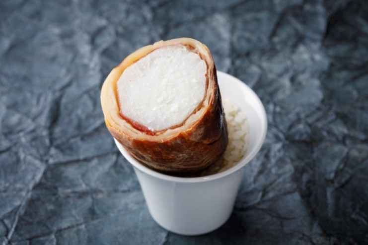 粕汁をイメージして作ったというまいこ里芋を使った料理は、パンチェッタでまいこ里芋を巻き、酒粕で包んでローストした一品に。
