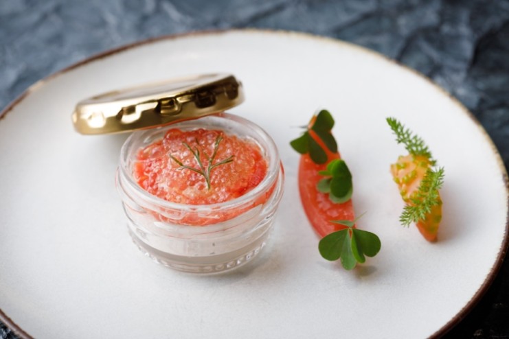 トマトの果肉とゼリー状の種の部分を分け、総料理長 柏木が丹後王国内のハーブガーデンで見つけたノコギリソウとカタバミを上にのせたシンプルなものです。