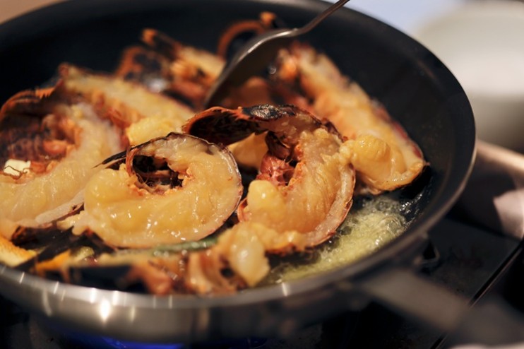 西洋野菜フヌイユのピューレとオマールの殻でつくったジュをお皿へ注ぐ総料理長 柏木。