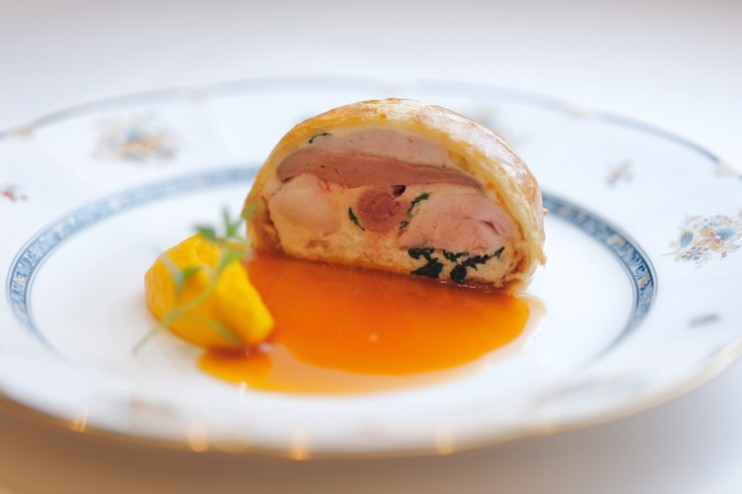 仔ウサギはフレッシュなハーブと白ポルト酒でマリネ。添えられた仔ウサギのジュはスパイシーなハーブ・サリエットの香りが広がり食欲をそそります。鶏肉のようにさっぱりとした仔ウサギとフォワグラのコントラストがシンプルに伝わってくる一品です。人参のすっきりとした甘みが香るクミン風味の人参のピュレと共にいただくと、さらに華やかなひと口へ。こちらは、「ジュヴレ・シャンベルタン ヴィエイユ・ヴィーニュ ドメーヌ・ロシニョール・トラぺ2022」の赤ワインと一緒に。