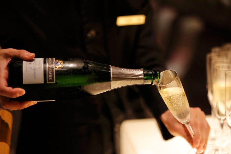 開場時間となり、煌びやかな会場には続々とお客様の姿が。アペリティフ(食前酒)には、猛暑の中ご来場くださるお客様に、会場に入ってすぐ涼を感じていただけるようにとの思いから、キンキンに冷やしたスパークリングワイン「クレマン・ド・ブルゴーニュ」を、コースとは別の料理と共にお迎えしました。「クレマン・ド・ブルゴーニュ」はシャンパンのようなキリっとした酸やふくよかさをしっかりと感じる味わいながら、泡立ちがきめ細やかでマイルドな口あたり。乾いた喉をやさしく潤していただきたいという思いで選んだ1本です。