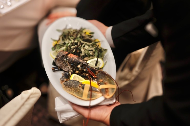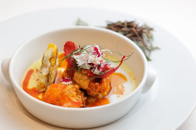 総料理長 柏木が手がける、山椒の爽やかな香りを忍ばせた夏らしい4品目、「夏の茸 鰻 山椒のエキュム」を味わっていただくと、コースは折り返しに。二人のシェフそれぞれ渾身のメイン料理の登場です。会場では、サービススタッフが調理前のオマールブルーと黒文字、バニラをお皿に乗せてお客様に披露する演出が始まりました。大きなオマールブルーを目で楽しむと同時に、会場内にほのかな柑橘と甘い香りが漂ってきます。まさに五感でもおいしさを楽しむ時間に。