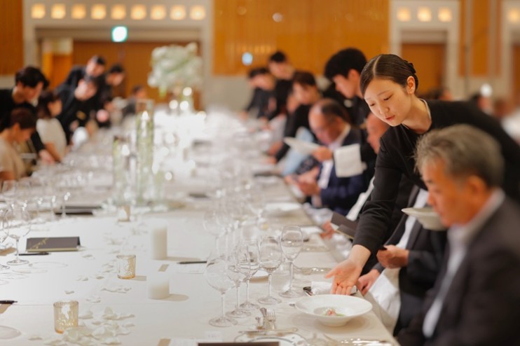 この特別な饗宴のために全力を注いだのは、シェフたちだけではありません。晩餐会のようなひと時を楽しんでもらおうと、一斉にお客様へ料理をサーブするなど、サービススタッフたちも華やかな演出に奔走します。