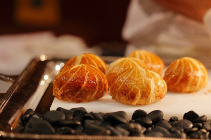 オマールブルーの深みのある味わいを楽しんだ後は、𠮷野シェフによるメイン料理「仔ウサギのトゥールト サリエットの香り」の登場です。特設の料理台ではシェフたちが仕上げに取りかかり、仔ウサギとフォワグラ入りの贅沢なムースを包んだパイをカットしていきます。
