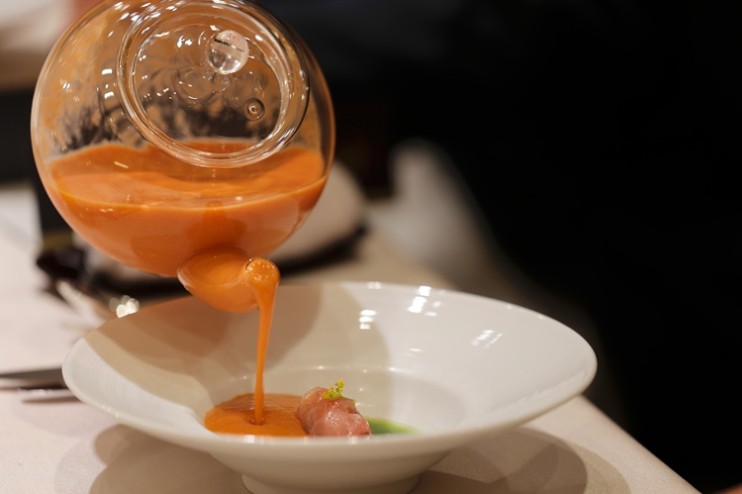 𠮷野シェフによる3品目の「夏野菜のガスパチョ 季節の魚介と共に」。ペアリングは、桃のような香りを感じる白ワインの「プイィ・フュメ ドメーヌ・タボルデ 2023」を。