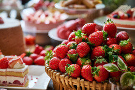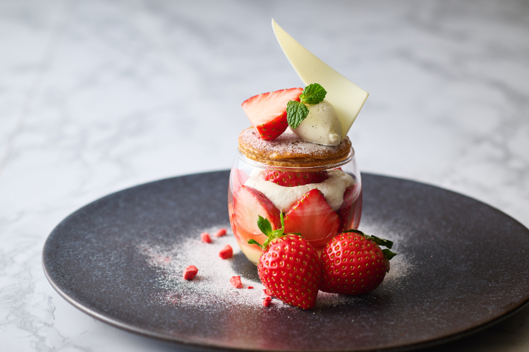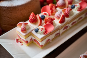 あまおう苺のショートケーキやタルトのほか、クリスマスツリー型のプチタルト、苺のレアチーズをサンタクロースに見立てた
