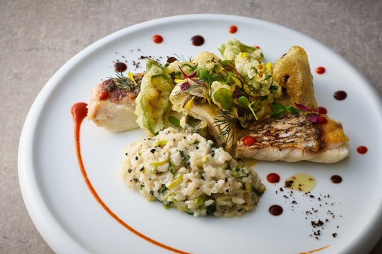 その日おすすめの京都産の魚に、京都丹波産こしひかりを使用したトリュフリゾットを添えて。