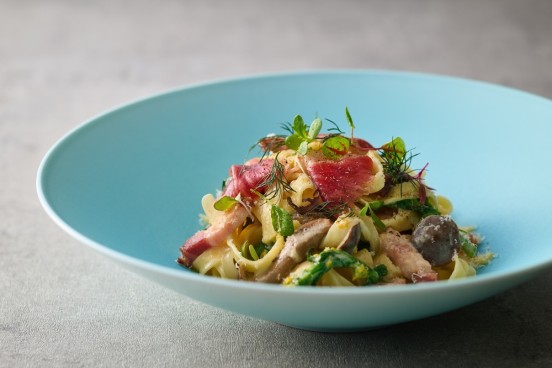 カルボナーラソースには、美山の平飼い卵、京都産のパールコーンや野菜などのピューレを使用し、あっさりとした口当たりに仕上げました。