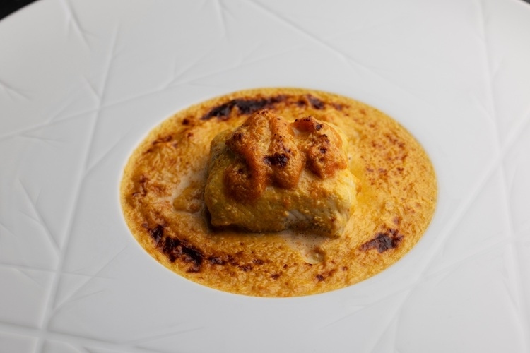 | < 前 菜 > 九条一遍ねぎとタスマニアサーモンのプレッセ キャビア 千鳥酢のグリヴィッシュソース |