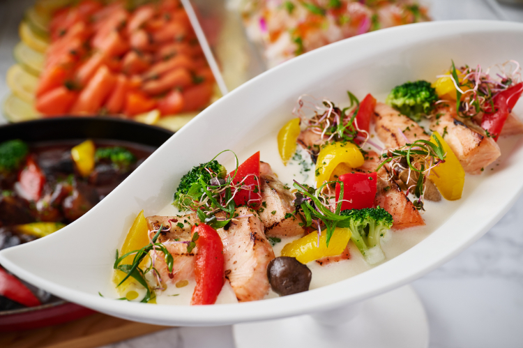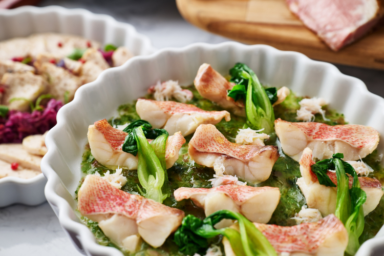 | 西京味噌香るサーモンのオーブン焼き 水尾柚子香る聖護院かぶらのソース |